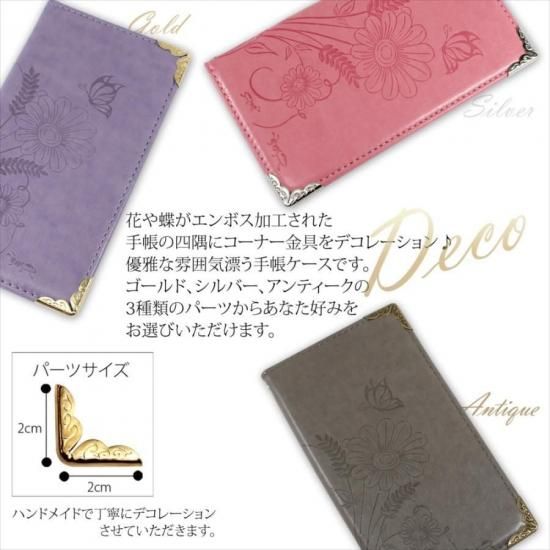 ・美しい花と、花の香りに誘われて集う蝶が型押しされたケースにコーナーパーツをデコレーションしました。