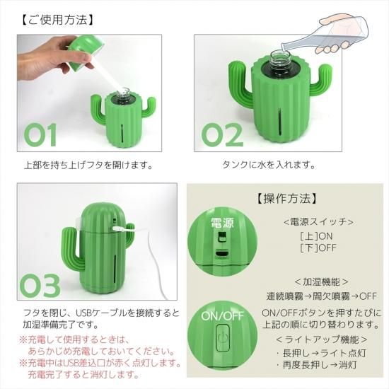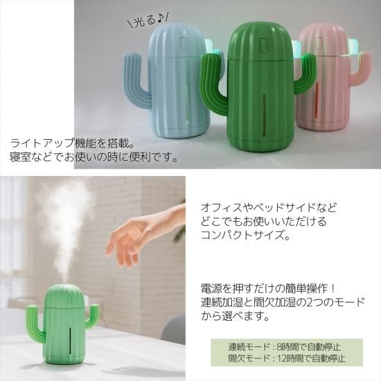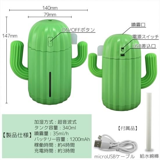 加湿器 卓上 超音波 サボテン USB 充電式 1200mAh ミスト加湿器 340ml ライトアップ 卓上加湿器 オートストップ 【宅配便のみ】