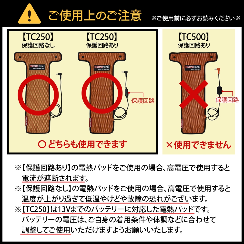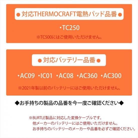![]() ![]() ![]() ![]() ![]() ![]() ■商品説明 ・BURTLE社製の防寒ジャケットや防寒ベストに装着可能なサーモクラフト電熱パッド【TC250】を、2025年製、2024年製、2023年製、2022年製のバッテリーでご使用頂くための商品となります。 ・サーモクラフト電熱パッド【TC250】には、2021年製以前のバッテリーしか対応していませんが、この変換ケーブルを使うと2025年製、2024年製、2023年製、2022年製のバッテリーでも使用できるようになります。 ・BURTLE THERMOCRAFT TC250 HEATING PADにて動作確認済みです。 ■対応型番 対応型番表をご参照ください。 ※対応型番以外の製品にはご使用いただけません。 ■ご使用上のご注意 ◆ご購入前に必ずお読みください◆ ※【保護回路あり】の電熱パッドをご使用の場合、高電圧で使用すると電流が遮断されます。 ※【保護回路なし】の電熱パッドをご使用の場合、高電圧で使用すると温度が上がり過ぎて低温やけどや故障の恐れがございます。 ※【TC250】は13Vまでのバッテリーに対応した電熱パッドです。 バッテリーの電圧はご自身の着用条件や体調に合わせて調整してご使用いただけますようお願いいたします。