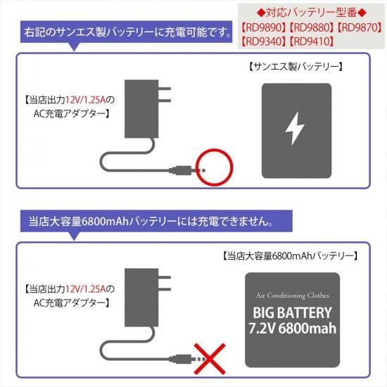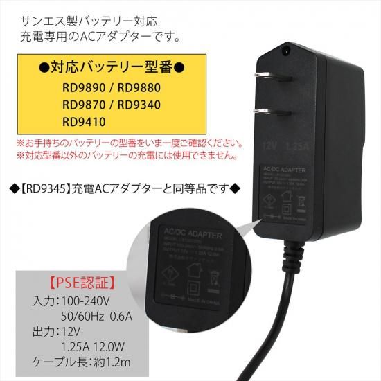 RD9345 同等品 サンエス製バッテリー対応 AC充電アダプター ファン付き作業服 12V 急速充電 高速充電 充電 アダプター 1.25A 充電器