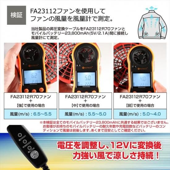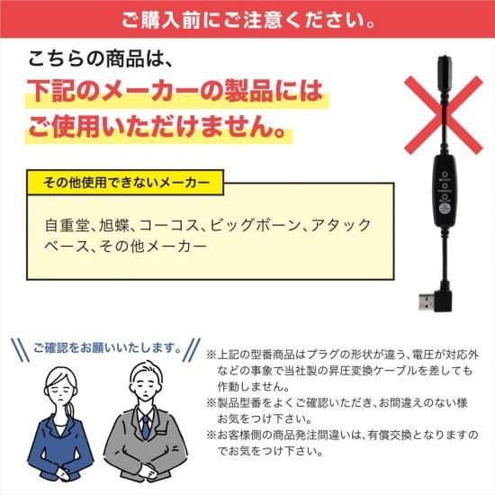 ![]() ![]() ![]() ![]() ![]() ![]() ![]() ![]() ■商品説明 ・QC3.0対応のモバイルバッテリーの出力を12Vに昇圧することができるUSB昇圧アダプターです。 ・このアダプタにより、モバイルバッテリーをファン付き作業服のバッテリーとして使用できるようになります。 ・USB端子は断線に強いL型コネクタ。 ・胸元のケーブルのもたつきも軽減します。 ・風量を3段階で調節できるスイッチが付いており、気温や体調に合わせて簡単に風量が調節できます。 ■対応型番 対応型番表をご参照ください。 ※対応型番以外の製品にはご使用いただけません。