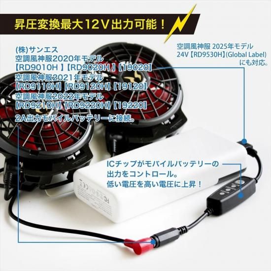 ![]() ![]() ![]() ![]() ![]() ![]() ![]() ![]() ■商品説明 ・QC3.0対応のモバイルバッテリーの出力を12Vに昇圧することができるUSB昇圧アダプターです。 ・このアダプタにより、モバイルバッテリーをファン付き作業服のバッテリーとして使用できるようになります。 ・USB端子は断線に強いL型コネクタ。 ・胸元のケーブルのもたつきも軽減します。 ・風量を3段階で調節できるスイッチが付いており、気温や体調に合わせて簡単に風量が調節できます。 ■対応型番 対応型番表をご参照ください。 ※対応型番以外の製品にはご使用いただけません。