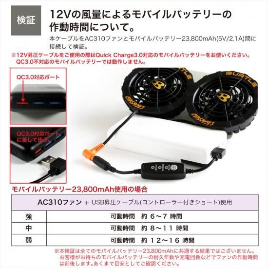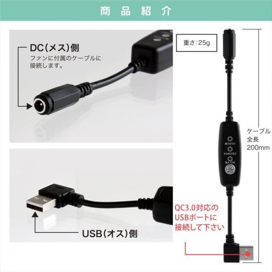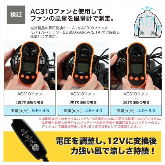 ![]() ![]() ![]() ![]() ![]() ![]() ![]() ![]() ![]() ![]() ■商品説明 ・QC3.0対応のモバイルバッテリーの出力を12Vに昇圧することができるUSB昇圧アダプターです。 ・このアダプタにより、モバイルバッテリーをファン付き作業服のバッテリーとして使用できるようになります。 ・USB端子は断線に強いL型コネクタ。 ・胸元のケーブルのもたつきも軽減します。 ・風量を3段階で調節できるスイッチが付いており、気温や体調に合わせて簡単に風量が調節できます。 ■対応型番 対応型番表をご参照ください。 ※対応型番以外の製品にはご使用いただけません。