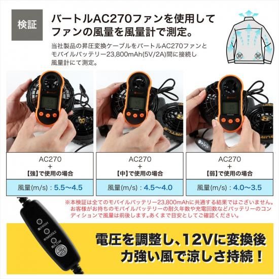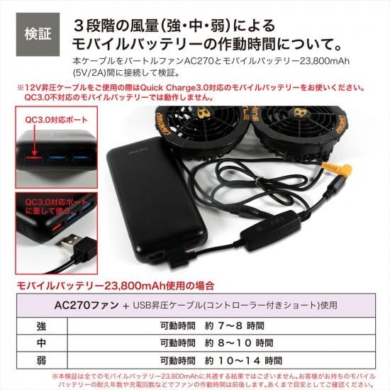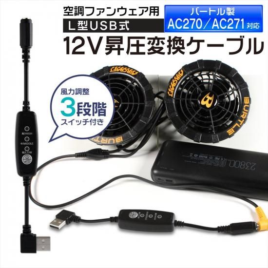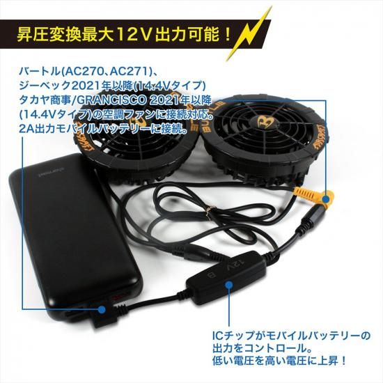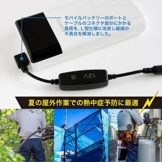 ![]() ![]() ![]() ![]() ![]() ![]() ![]() ![]() ■商品説明 ・QC3.0対応のモバイルバッテリーの出力を12Vに昇圧することができるUSB昇圧アダプターです。 ・このアダプタにより、モバイルバッテリーをファン付き作業服のバッテリーとして使用できるようになります。 ・USB端子は断線に強いL型コネクタ。 ・胸元のケーブルのもたつきも軽減します。 ・風量を3段階で調節できるスイッチが付いており、気温や体調に合わせて簡単に風量が調節できます。 ■対応型番 対応型番表をご参照ください。 ※対応型番以外の製品にはご使用いただけません。
