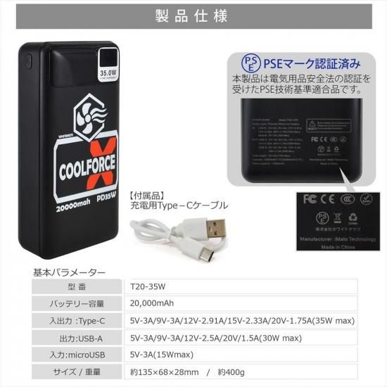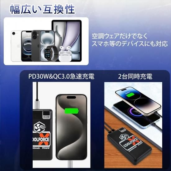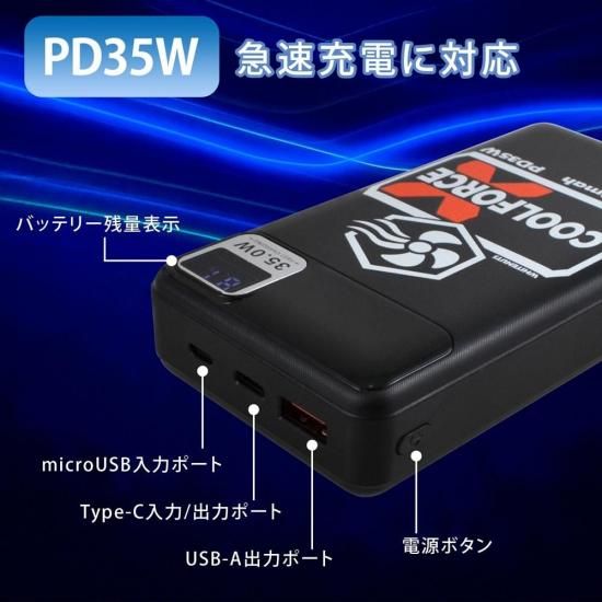 モバイルバッテリー 空調ウェア 大容量 20000mAh PD35W 急速充電 空調ファン 作業服 Type-C USB-A microUSB 【PSE認証 】