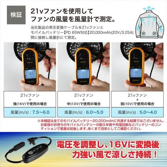![]() ![]() ![]() ![]() ![]() ![]() ![]() ![]() ■商品説明 ・PD対応のモバイルバッテリーの出力を16Vに昇圧することができるType-C昇圧アダプターです。 ・このアダプタにより、モバイルバッテリーをファン付き作業服のバッテリーとして使用できるようになります。 ・Type-C端子は断線に強いL型コネクタ。 ・胸元のケーブルのもたつきも軽減します。 ・風量を3段階で調節できるスイッチが付いており、気温や体調に合わせて簡単に風量が調節できます。 ■対応型番 対応型番表をご参照ください。 ※対応型番以外の製品にはご使用いただけません。