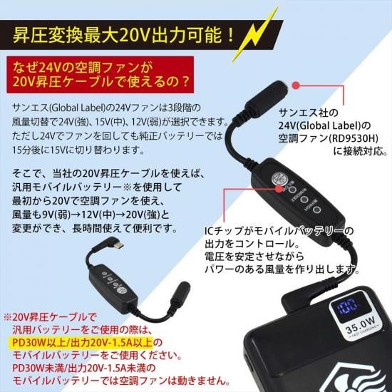 サンエス対応 24V RD9530H Global Label 20V Type-C昇圧 アダプター L型 Type-C PD対応 モバイルバッテリー スイッチ付き 【20V-C4】