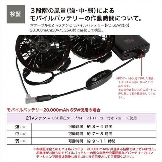 ![]() ![]() ![]() ![]() ![]() ![]() ![]() ![]() ■商品説明 ・PD対応のモバイルバッテリーの出力を16Vに昇圧することができるType-C昇圧アダプターです。 ・このアダプタにより、モバイルバッテリーをファン付き作業服のバッテリーとして使用できるようになります。 ・Type-C端子は断線に強いL型コネクタ。 ・胸元のケーブルのもたつきも軽減します。 ・風量を3段階で調節できるスイッチが付いており、気温や体調に合わせて簡単に風量が調節できます。 ■対応型番 対応型番表をご参照ください。 ※対応型番以外の製品にはご使用いただけません。