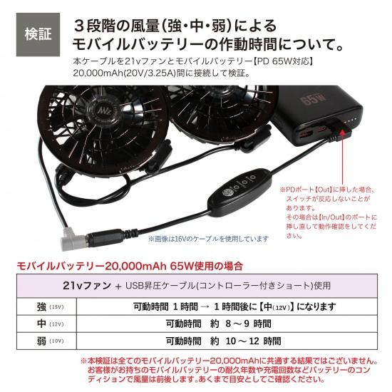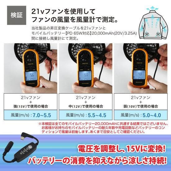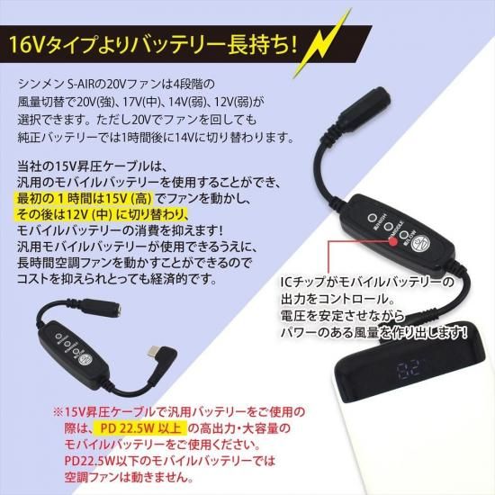 ![]() ![]() ![]() ![]() ![]() ![]() ![]() ![]() ■商品説明 ◇16Vタイプよりバッテリー長持ち!◇ 最初の1時間は15V! その後は12Vに切り替わるのでバッテリーの消費を抑えられます! ・PD対応のモバイルバッテリーの出力を15Vに昇圧することができるType-C昇圧アダプターです。 ・このアダプタにより、モバイルバッテリーをファン付き作業服のバッテリーとして使用できるようになります。 ・Type-C端子は断線に強いL型コネクタ。 ・胸元のケーブルのもたつきも軽減します。 ・風量を3段階で調節できるスイッチが付いており、気温や体調に合わせて簡単に風量が調節できます。 ■対応型番 対応型番表をご参照ください。 ※対応型番以外の製品にはご使用いただけません。