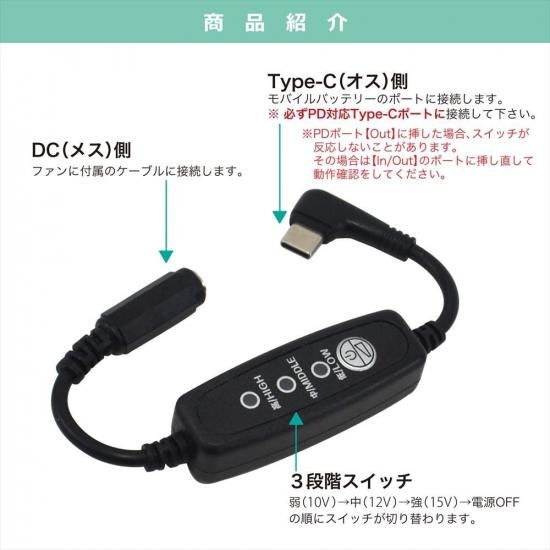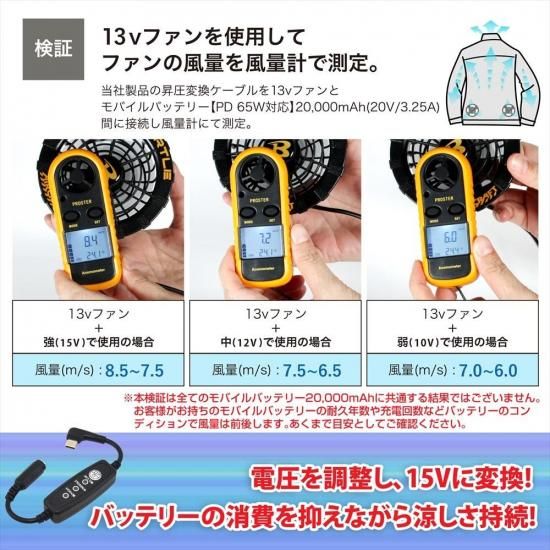 ![]() ![]() ![]() ![]() ![]() ![]() ![]() ![]() ■商品説明 ◇16Vタイプよりバッテリー長持ち!◇ 最初の1時間は15V! その後は12Vに切り替わるのでバッテリーの消費を抑えられます! ・PD対応のモバイルバッテリーの出力を15Vに昇圧することができるType-C昇圧アダプターです。 ・このアダプタにより、モバイルバッテリーをファン付き作業服のバッテリーとして使用できるようになります。 ・Type-C端子は断線に強いL型コネクタ。 ・胸元のケーブルのもたつきも軽減します。 ・風量を3段階で調節できるスイッチが付いており、気温や体調に合わせて簡単に風量が調節できます。 ■対応型番 対応型番表をご参照ください。 ※対応型番以外の製品にはご使用いただけません。