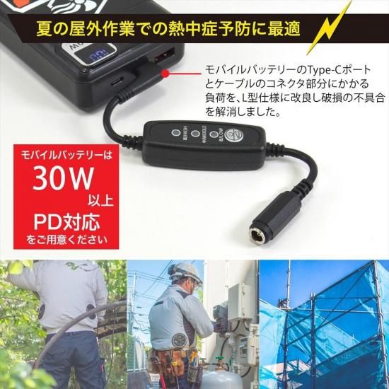 ![]() ![]() ![]() ![]() ![]() ![]() ■商品説明 ・PD対応のモバイルバッテリーの出力を18Vに昇圧することができるType-C昇圧アダプターです。 ・このアダプタにより、モバイルバッテリーをファン付き作業服のバッテリーとして使用できるようになります。 ・Type-C端子は断線に強いL型コネクタ。 ・胸元のケーブルのもたつきも軽減します。 ・風量を3段階で調節できるスイッチが付いており、気温や体調に合わせて簡単に風量が調節できます。 ■対応型番 対応型番表をご参照ください。 ※対応型番以外の製品にはご使用いただけません。
