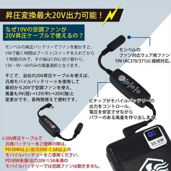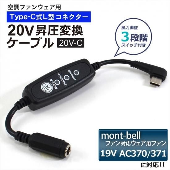 モンベル ファン対応ウェア用ファン 対応 19V AC370/371 Type-C昇圧 アダプター Type-C PD対応 モバイルバッテリー スイッチ付き 【20V-C】