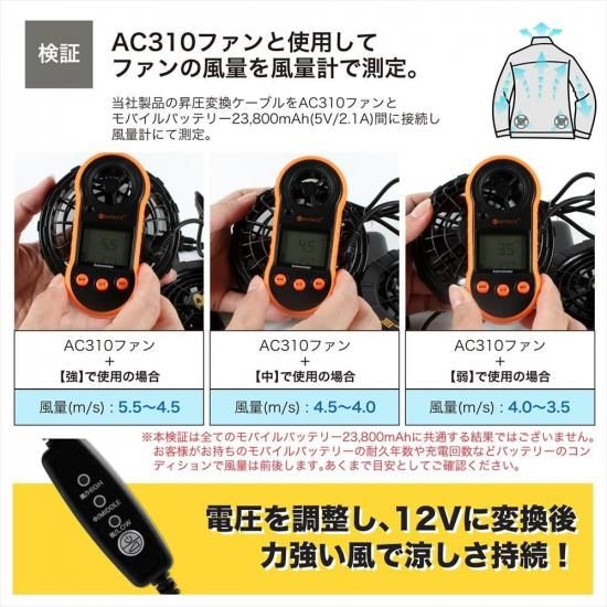 ![]() ![]() ![]() ![]() ![]() ![]() ![]() ![]() ■商品説明 ・QC3.0対応のモバイルバッテリーの出力を12Vに昇圧することができるUSB昇圧アダプターです。 ・このアダプタにより、モバイルバッテリーをファン付き作業服のバッテリーとして使用できるようになります。 ・USB端子は断線に強いL型コネクタ。 ・胸元のケーブルのもたつきも軽減します。 ・風量を3段階で調節できるスイッチが付いており、気温や体調に合わせて簡単に風量が調節できます。 ■対応型番 対応型番表をご参照ください。 ※対応型番以外の製品にはご使用いただけません。